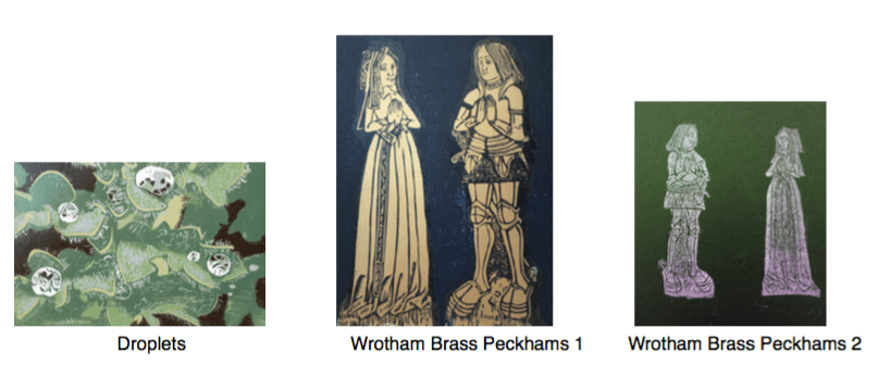 I have added 3 new prints to my gallery and featured them in the Latest page. The Droplets woodcut print was an attempt to capture the brightness of light reflected in raindrops on a Horned Poppy leaf with a degree of ambiguity to create a nearly abstract pattern. The two prints based on the memorial brass for the early 16th century Thomas and Dorothy Peckham from the Wrotham St George’s Church floor allowed me to experiment with the difference in wood cut and wood engraving and the use of gold ink as a bass in the wood cut and as the printing ink in the wood engraving. I really liked the economy of line in the original brass design and this is my homage to them. Click here to visit the Latest page for more details
