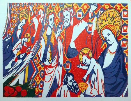 Christmas 2020: This 6 woodcut block print is inspired by the images from a 12th century illuminated manuscript where I moved the images and removed the original palace setting replacing it with a lowly stable. As far as possible I retained the enigmatic facial expressions of the original. This is a limited edition print (60) but no more available. Click here to see the full image
