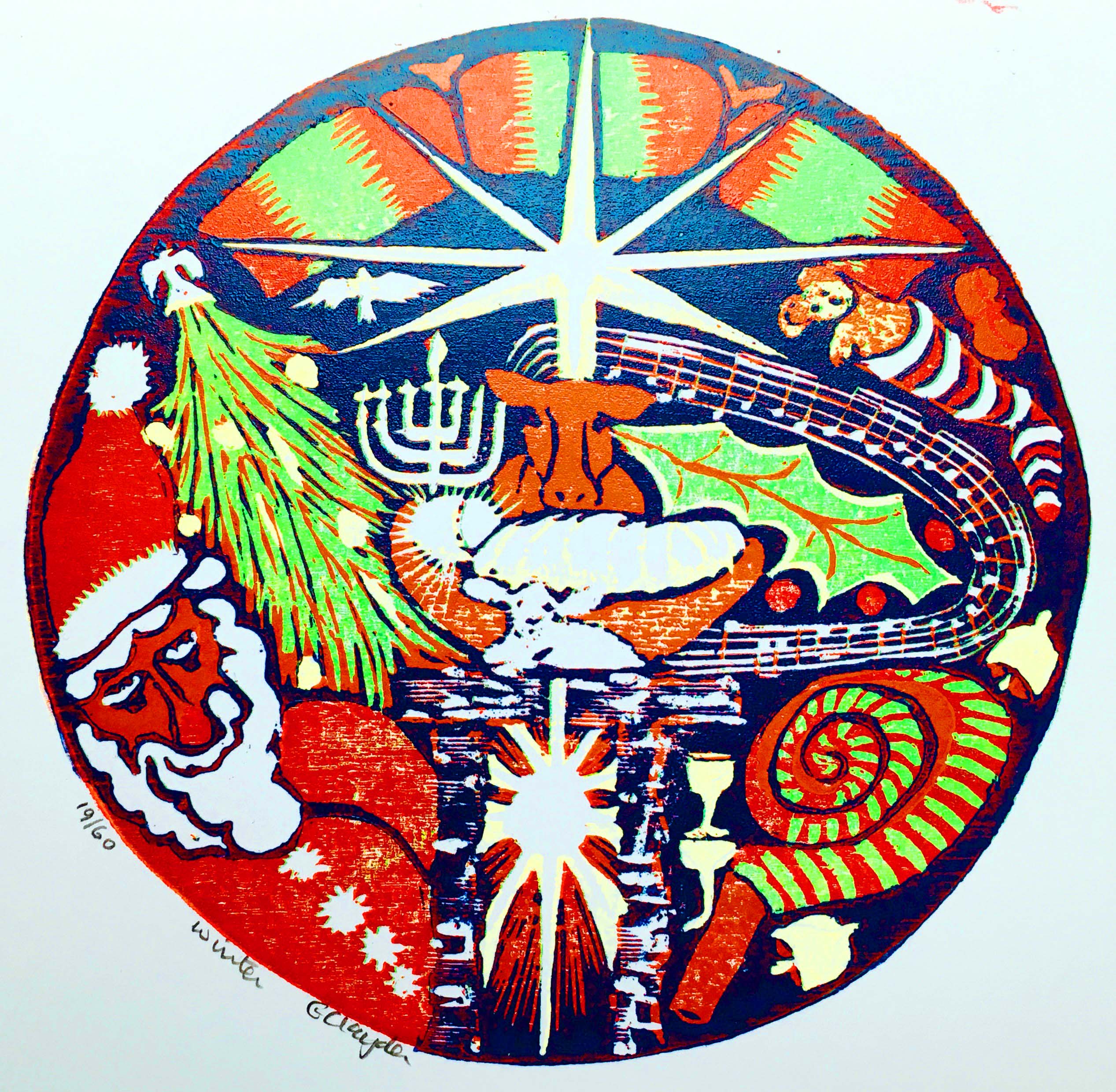 Winter (Christmas 2018): This 5 woodcut block print is an attempt to merge multi faith images to celebrate the main winter festivals. This is a limited edition print (60) only 2 available. Click here to see the full image