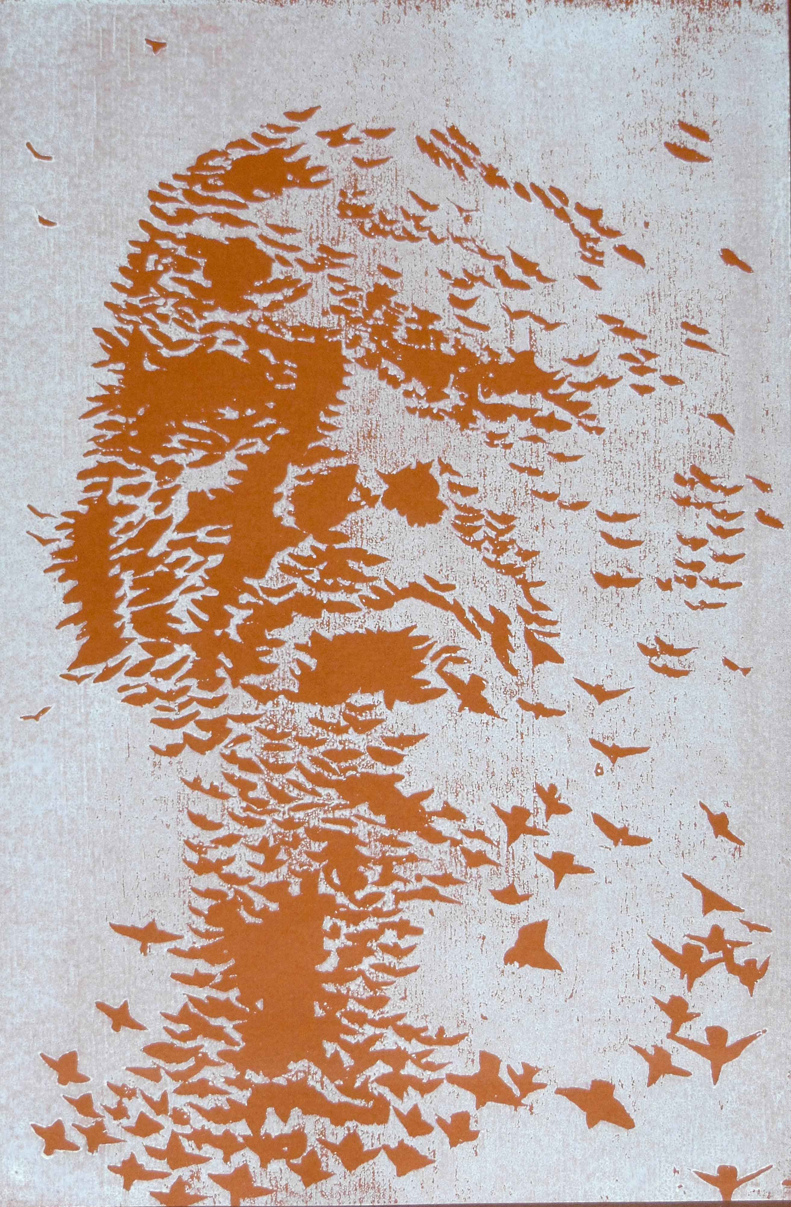 - Mandela: This is a 30 x 20 cm limited edition (50) hand print from a block wood cut. The inspiration for this wood cut was the sculpture by Ian Walters that can be visited on the bridge side of the Royal Festival Hall in London. My first sketch led me to use a series of small bird shape mono prints to build up the image. I then cut the individual birds into the wood and made a reverse print as shown here. Usually the darker areas of the print are from the wood left intact but here I use a lighter print pigment on a brown background. I have always been fascinated by the shapes made by flocks of starlings as they gather at dusk and here I used this murmuration to make my image.Some original prints are still available for 30 pounds, mounted for 45 pounds or framed for 60 pounds. Click here to see the full image.