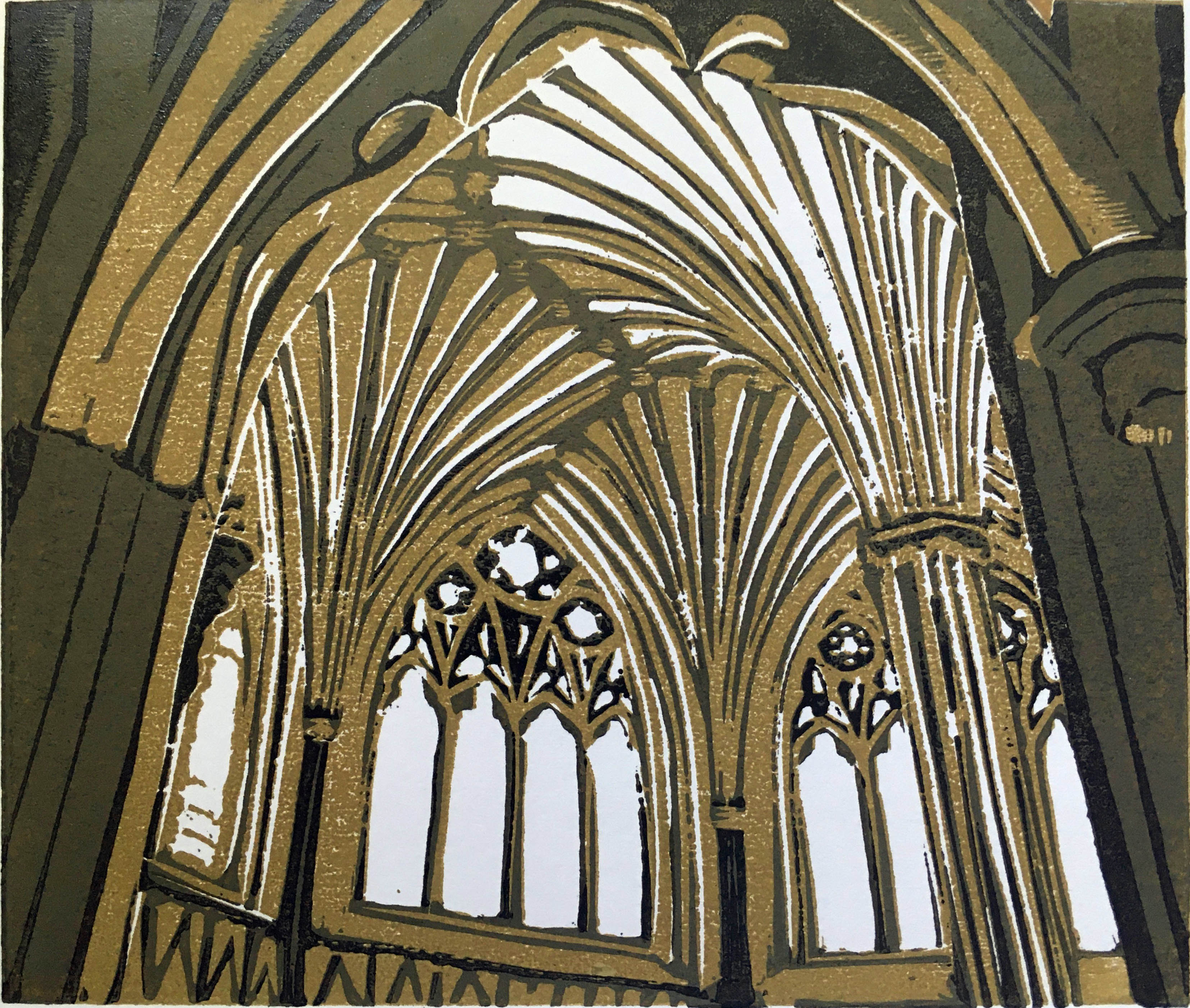 WellsChapter is a limited edition (12) hand printed 2 block reduction woodcut (11.5 x 10cm) inspired by the fan vaulting ceiling of the Wells Cathedral Chapterhouse. Click here to see the image more clearly
