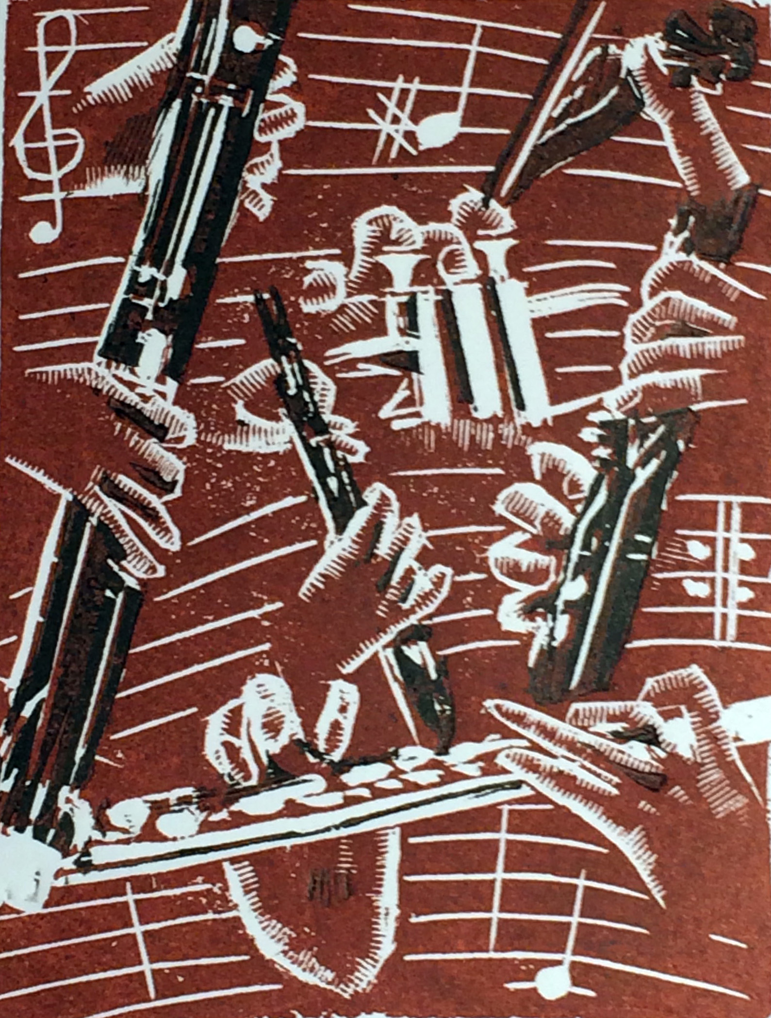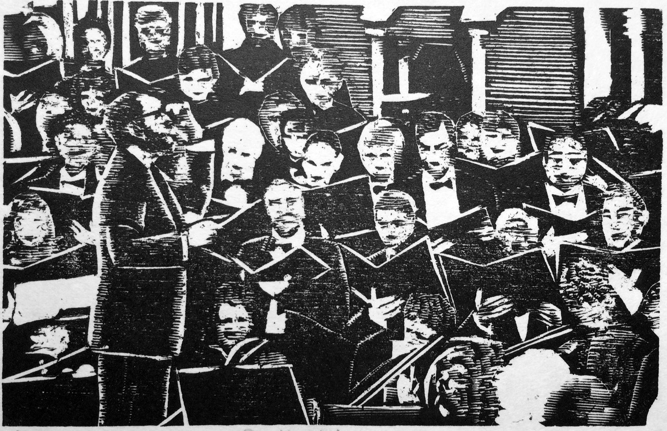 - Double choir: This is a 10 x 15 cm limited edition (60) hand print from a single block wood cut . This is an image of Beckenham Chorale in performance and I was inspired by the patterns made by the scores, violin bows and architecture. Click here to see the full image.