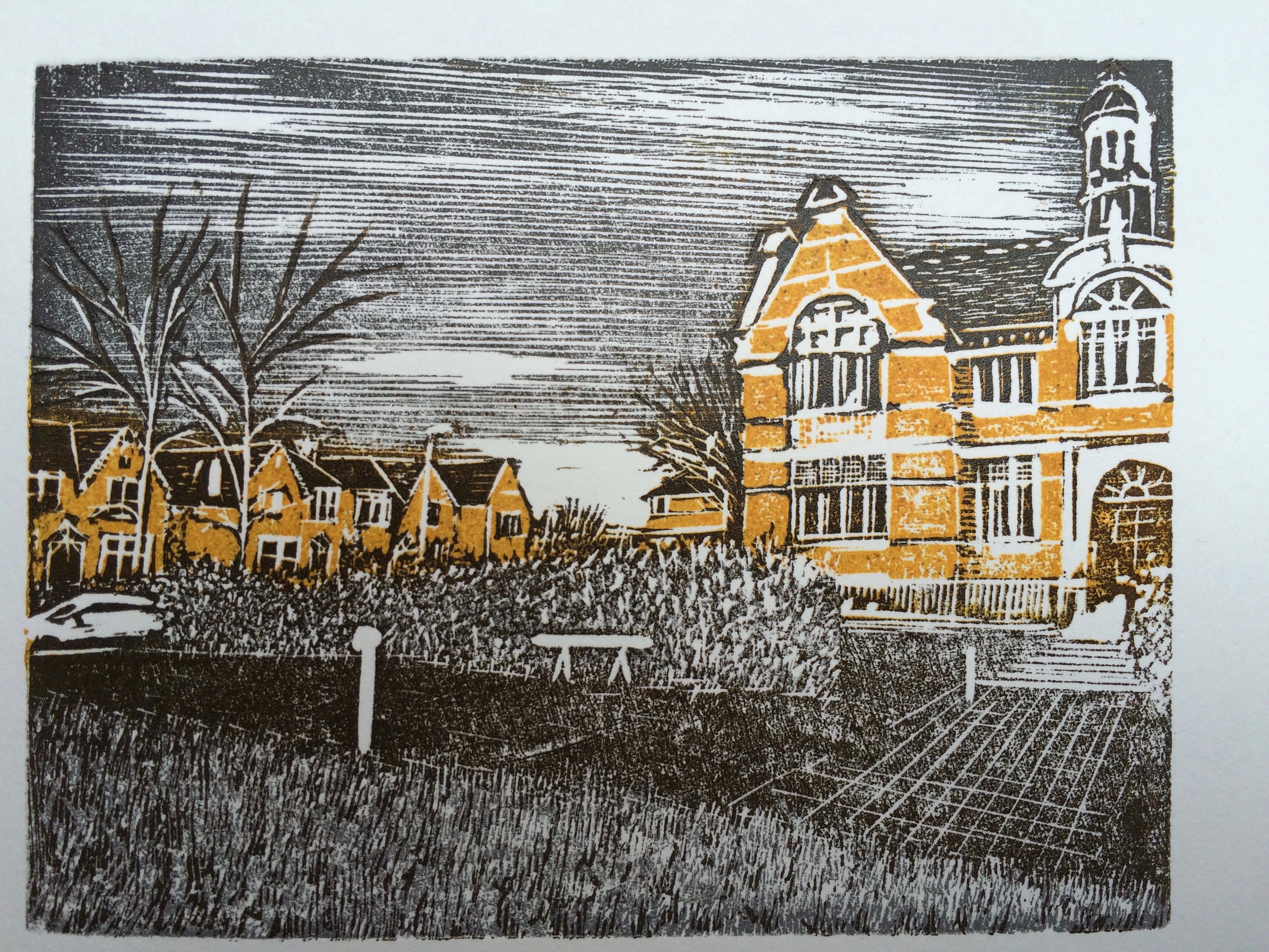 - Clock House: This is a 2 wood engraving block print of the view of the typical South London station. This reduction wood engraving block is 7.6 x 10 cm and is an original limited print edition of 10. Click here to see the full image.