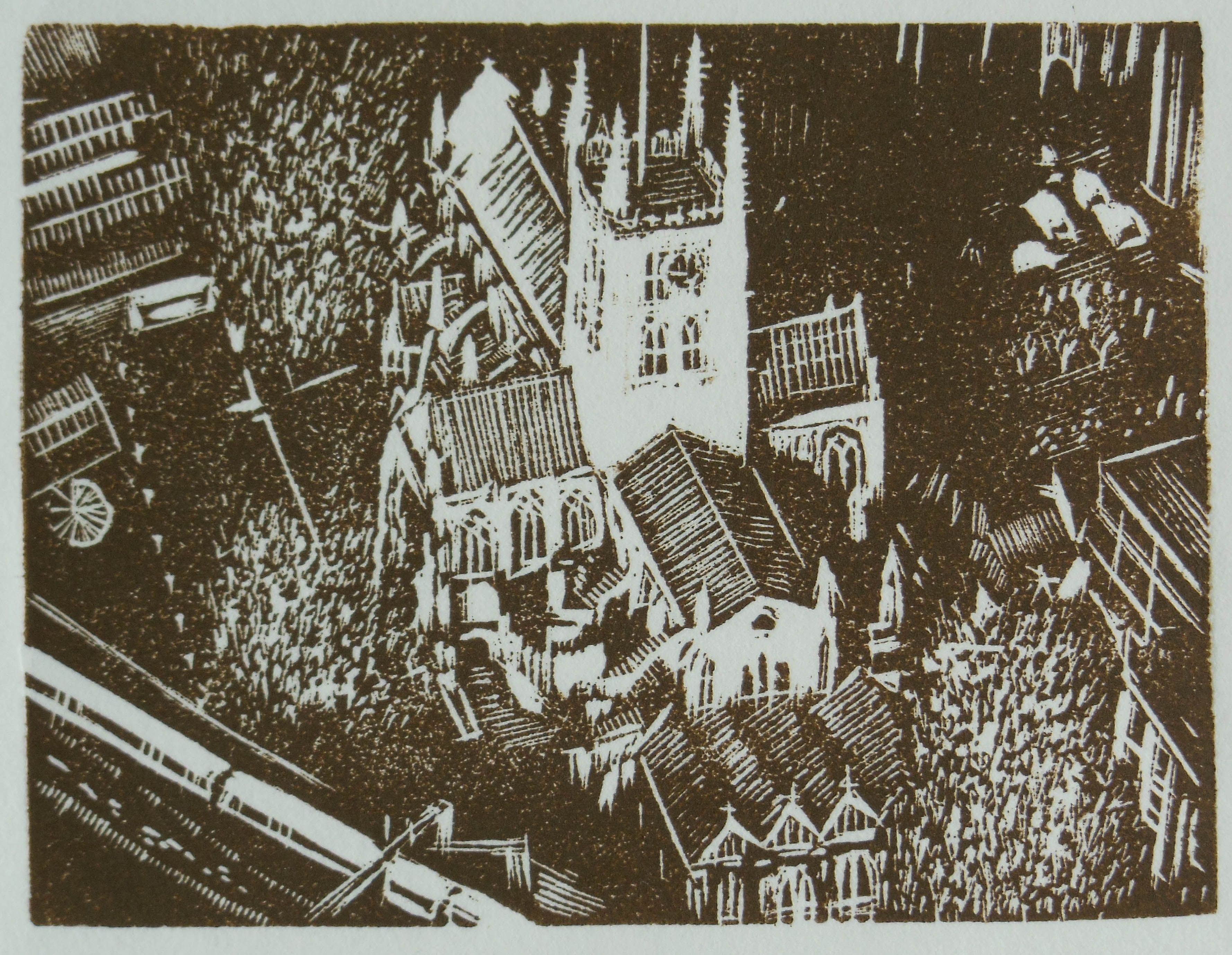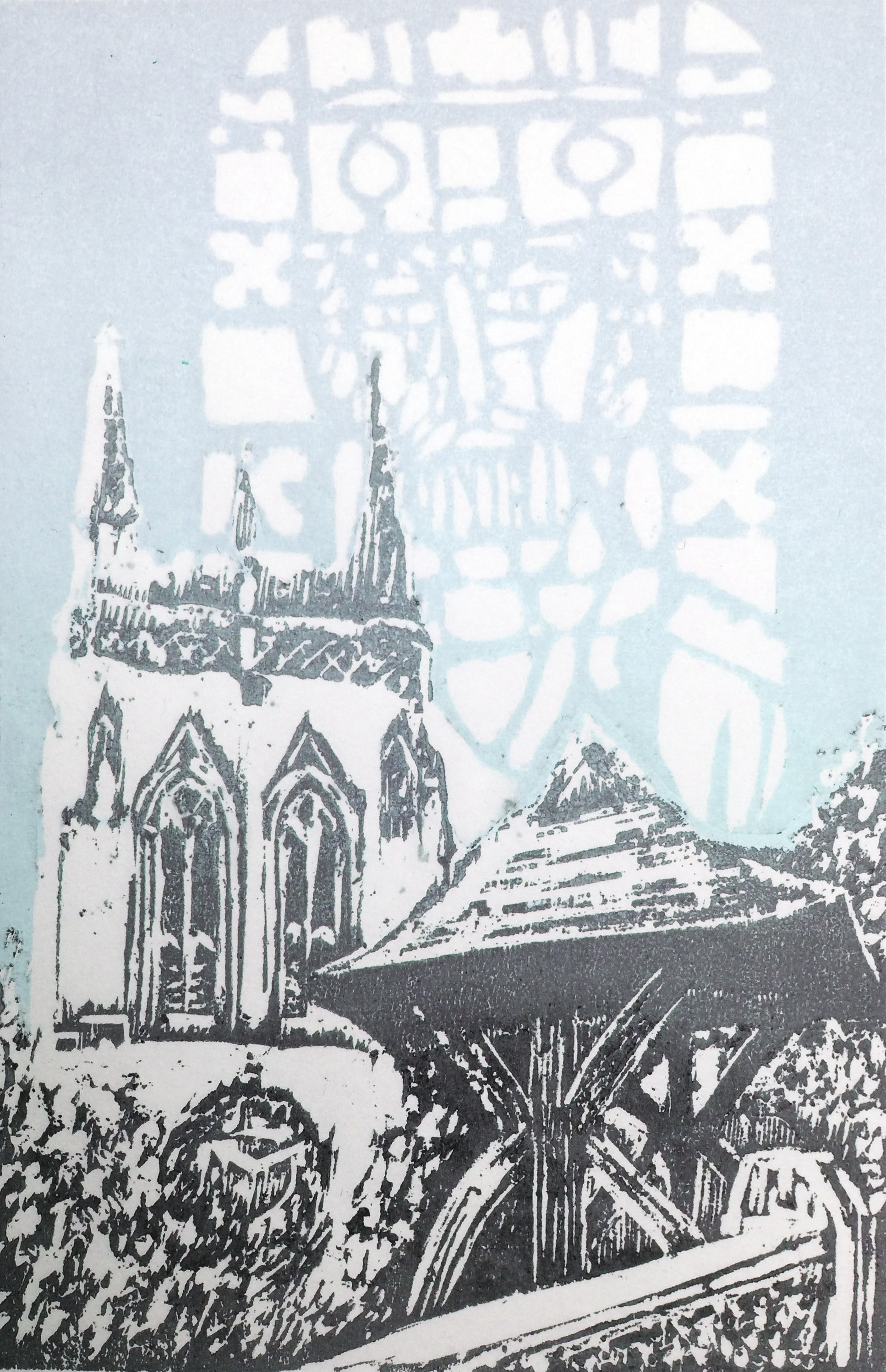 - S George’s: This is a 15 x 10 cm limited edition (50) hand print from a 2 block wood engraving. This is Beckenham’s parish church, venue for excellent concerts and home to amazing stained glass windows that replaced the ancient ones destroyed in WW2. Click here to see the full image.