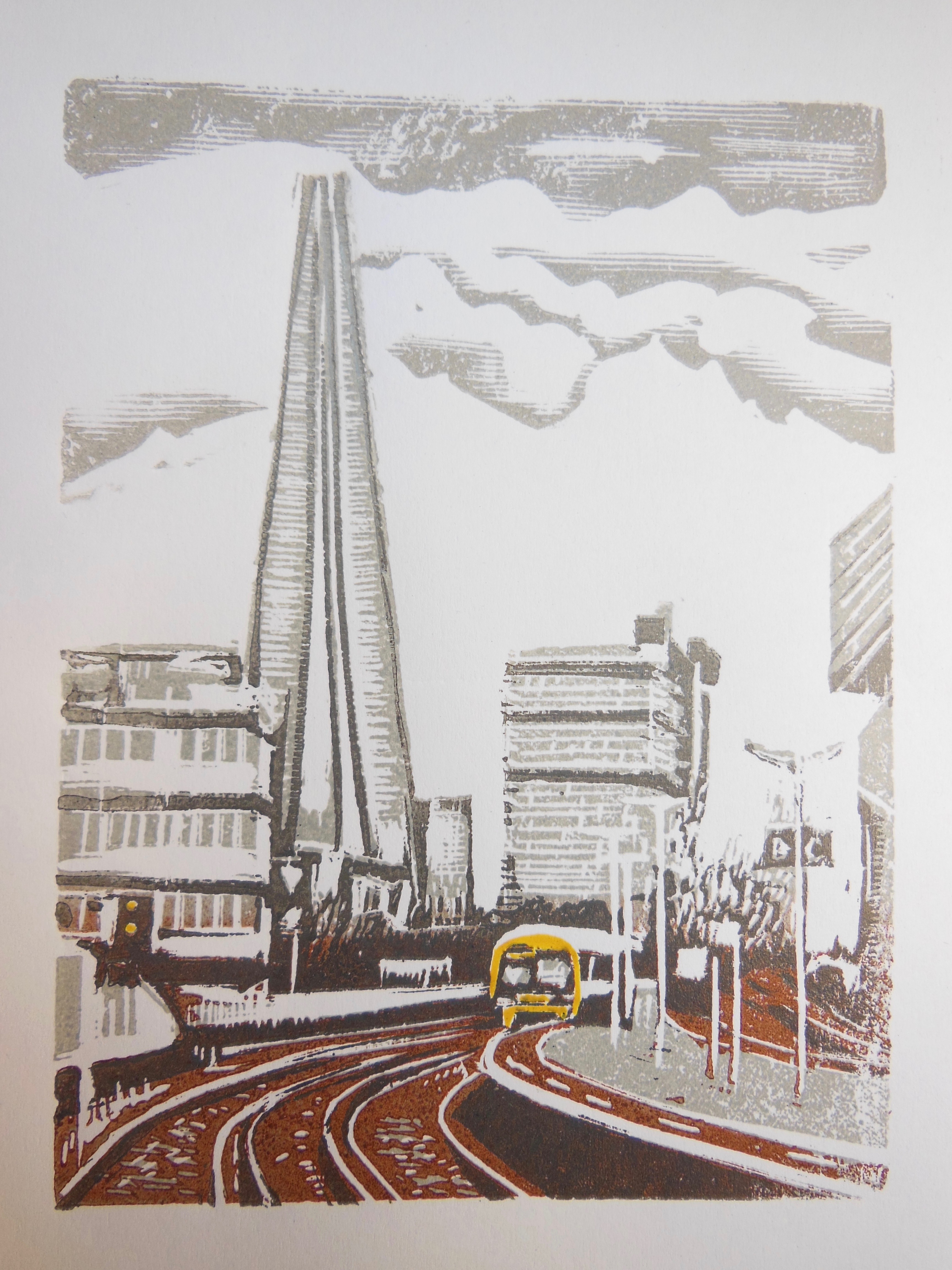 - Waterloo East: This is a 2 wood engraving block print of the view of the Shard and Guy’s Hospital Tower in London. This reduction wood cut block is 15 x 10 cm and is an original limited print edition of 32. Click here to see the full image.