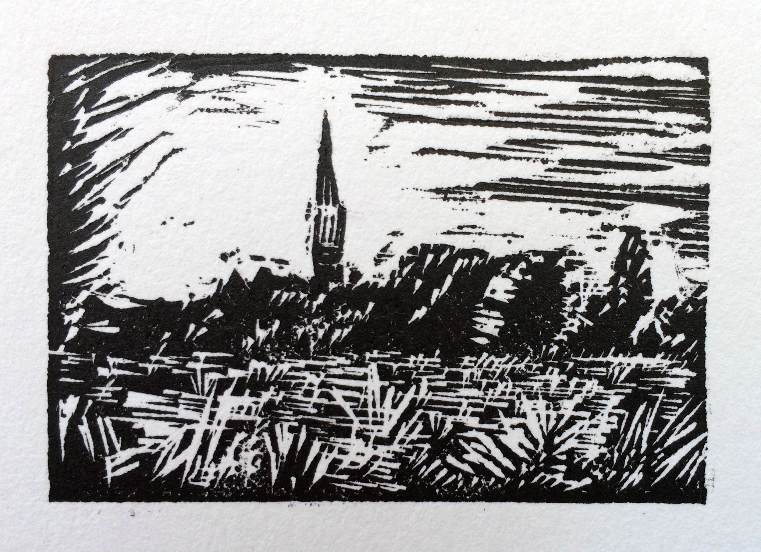 - Salisbury: This is a 5 x 3 cm limited edition (50) hand print from a single linocut . The image is from the view across the meadows to the cathedral.Click here to see the full image.