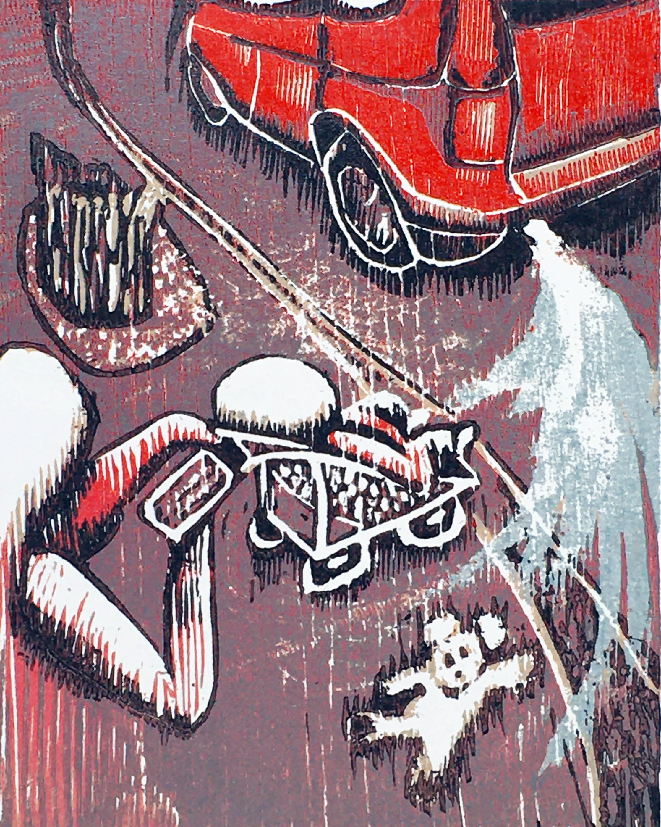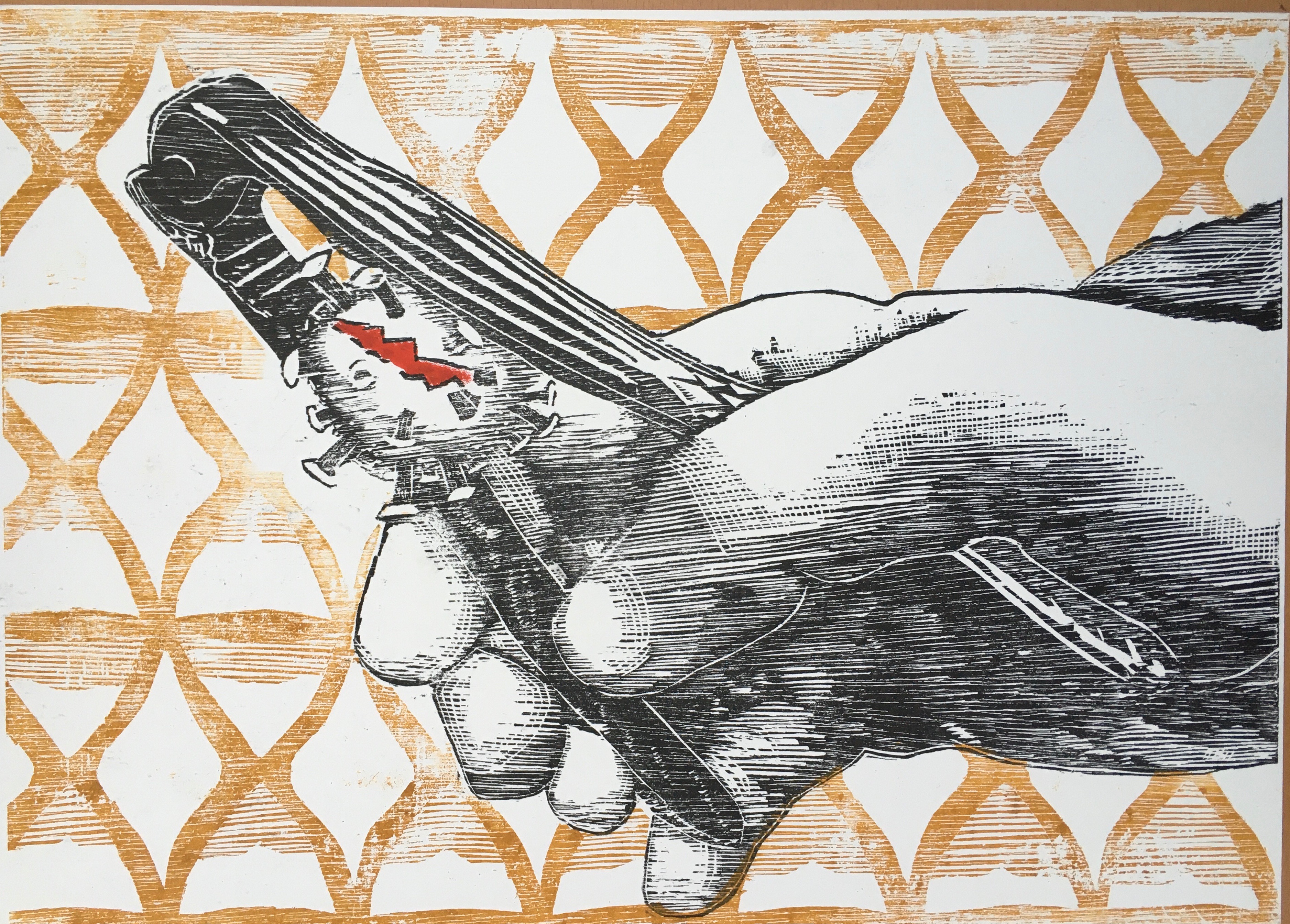 Tough nut is a limited edition (50) hand printed 3 block wood cut (41 x 29.5cm) as a reaction to anxious hope of an end to the corvid-19 pandemic with a background feeling of time running strangely. Click here to see the image more clearly.